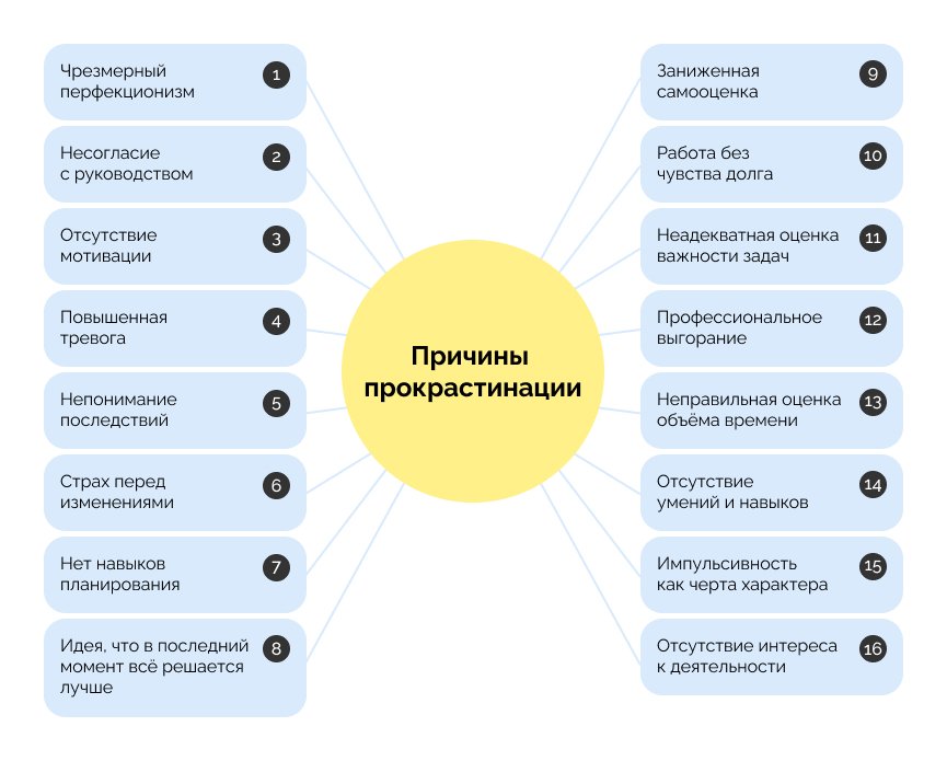 Чтобы учиться планировать с учетом прокрастинации, в первую очередь необходимо разобраться в природе этого явления. Прокрастинация — это не просто безделье или нежелание действовать, а сложный психоэмоциональный процесс. Мы можем прокрастинировать по разным причинам, и вот несколько самых распространенных из них: