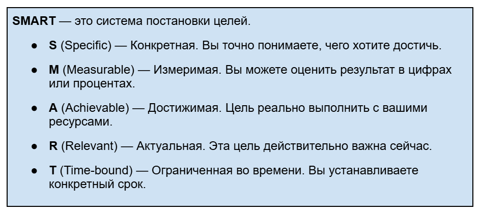 Этот подход помогает иметь ясное представление о прогрессе, а также ощущать регулярные победы, которые подзаряжают мотивацию.